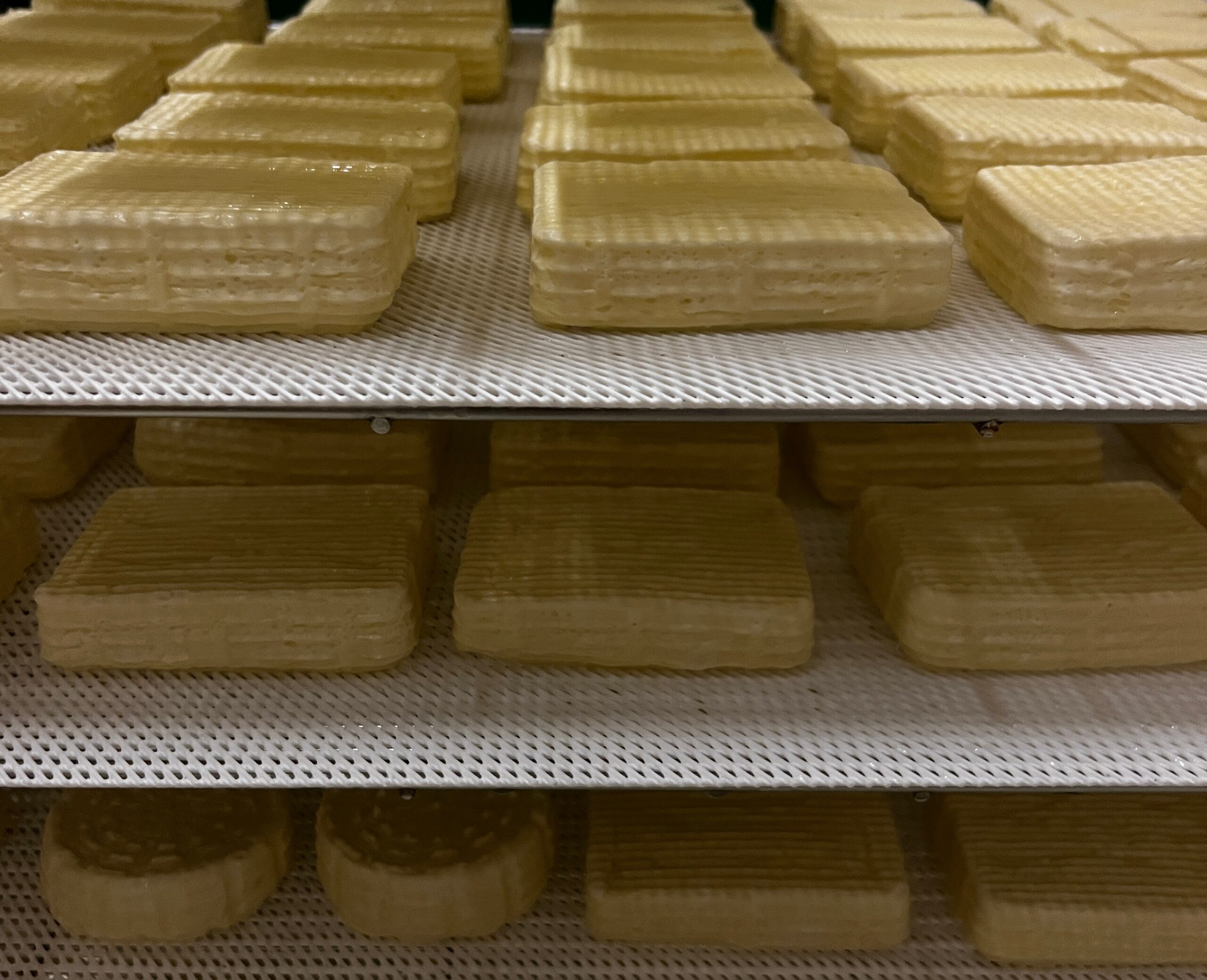 Ремісник більшість процесів виконує вручну. Контроль внесення закваски, розрізання, вимішування, перегортання та натирання скоринки – все це робить людина, а не механізована лінія. Сир перебуває під цілодобовою опікою сировара.